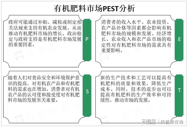 技术因素(Technological):技术进步对有机肥料市场的发展起到推动作用。新的生产技术和工艺可以提高有机肥料的质量和效果,降低生产成本。同时,技术的进步也可以提高有机肥料的生产效率和可持续性,推动市场的发展。